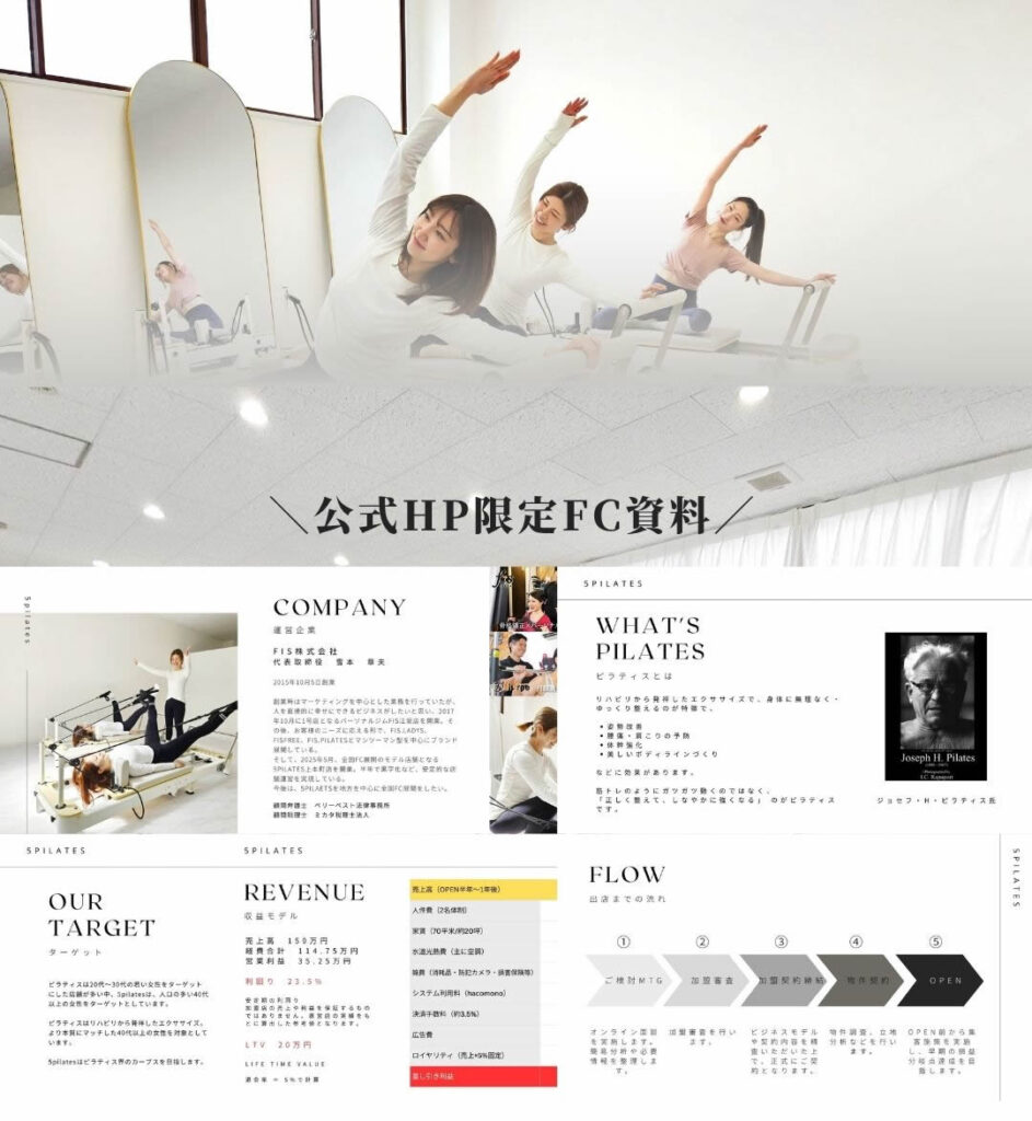 5pilatesは、全国FC展開を前提に仕組みを作った「女性だけの5人制マシンピラティス専門スタジオ」です。